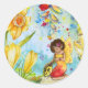 Eine skurrile und magische Illustration einer Fee unter den Blume in leuchtend farbenfroher Aquarellkunst.