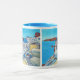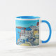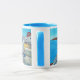 Lebhaftes, stilisiertes Gemälde von Santorini, Griechenland mit seiner majestätischen blauen Kuppel der beliebten Künstlerin Lisa Lorenz an einer Tasse.