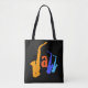 Farbenfrohe Saxophone als Buchstaben, die das Wort "Jazz" bilden. Beutel mit schwarzem Hintergrund (anpassbar).