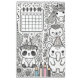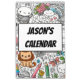 Ein individualisierbares Kinderkalender-Cover-Design mit einem whimsical doodle-Hintergrund voller charmanter Tiere, Regenbögen, Blume und spielerischen Objekten wie farbigen Stiften und Schmetterlingen. In der Mitte wird der Text "Jason's Calendar" in einem fett formatierten Panel angezeigt, das für jeden Namen leicht personalisierbar ist. Der Kunststil ist fröhlich und einladend, perfekt für ein junges Publikum.