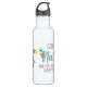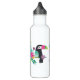 Diese wiederverwendbare Wasserflasche ist ein hübscher tropischer Aufdruck in lebhaften Farben mit einem niedlichen Cartoon Toucan, farbenfrohen tropischen Blätter und Blume und einem kleinen rosa Vogel. Der Titel, aus Einstein, lautet "Schau tief in die Natur und du wirst alles besser verstehen", in lila und hellblauen Schriftart.