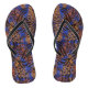 Schwarze Flip Flops mit braunen Zebrastreifen und Leopardenflecken auf blauem, braunem, goldfarbenem und orangefarbenem Hintergrund sind das perfekte Accessoire, um Ihr Outfit für jeden Anlass anzuziehen.
