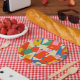 Farbenfrohe 80er Geometric Abstrakt Modern Pattern. Fröhliches Flickwerk und Punktedesign in hellen Farben mit einem fröhlichen Ambiente aus den 80er Jahren und einer Retro-modernen Ästhetik. Spaß und voller heller Farbe. Zeitgenössisches modernes Kunstdesign im 20. Jahrhundert. Von Kierkegaard Design Studio.
