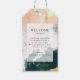 Diese farbenfrohen abstrakten Begrüßungstags sind perfekt für Ihre einzigartige moderne Hochzeit. Handgemalt mit strukturierten Pinselstrichen aus dunklem Smaragdgrün, Pfirsich und Senf, alles überlagert mit einem minimalistisch transparenten Quadrat, ist es sicher, Ihrem Anlass ein einfaches, aber rustikales bohemianisches Gefühl zu geben.