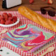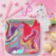 Moderner abstrakter, roter, lila, blauer, grüner, gelber Marmor im Jugendstil, Niedlich zum Geburtstag oder zu Feierlichkeiten.