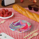 Moderner abstrakter, roter, lila, blauer, grüner, gelber Marmor im Jugendstil, Niedlich zum Geburtstag oder zu Feierlichkeiten.