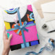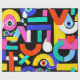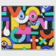 Farbiges abstraktes Muster mit Liebe in Wort, Augen, Tränen, Farbblöcken. Musterbeispiel mit hellen Farbblockierungen. Trendfarbenes geometrisches Muster aus Pop mit fetten Formen auf schwarz.