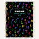 Zurück zur Schule Notizbuch personalisiert mit Namen und Thema, mit einem Muster von bunten Buchstaben, groß und klein.