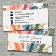 Mit dieser farbenfrohen Watercolor Feathers Black Script Name Business Card bleibend beeindrucken! Mit atemberaubenden Aquarellfedern in lebhaften Farbtönen wie Grün, Blau, Rosa, Orange und lila auf einem knackigen, weißen Hintergrund fügt diese Karte Ihrer beruflichen Marke eine stilvolle Touch hinzu. Personalisieren Sie den weißen Streifen mit Ihrem Namen und Beruf in eleganter schwarzer Schrift Typografie. Die Rückseite setzt das schöne Design fort, wo Sie alle Ihre wichtigen Kontaktdaten hinzufügen können, einschließlich E-Mail, Telefon, Website und Social Media. Perfekt für stilvolle Vernetzung!