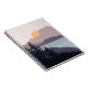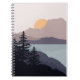 Abstrakte Illustration von farbenfroher Bergsee-Sonnenaufgang mit Sonne, Berggipfeln und Pinienbäumen Dekoration für alle, die Natur, Camping, Wandern etc. mögen.