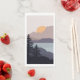 Abstrakte Illustration von farbenfroher Bergsee-Sonnenaufgang mit Sonne, Berggipfeln und Pinienbäumen Dekoration für alle, die Natur, Camping, Wandern etc. mögen.