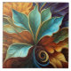 Ein lebendiges Zusammenspiel von Blätter in Blau, Grün, Orange und lila Farbtönen, das ein faszinierendes und lebendiges Dekorationsmuster schafft.