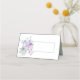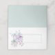 Hochzeitsgefaltete Platzkarte in weiß und leicht aquamarin mit einer hübschen Abbildung eines lila und aquamarinen Bouquets von Blume. Die Front ist bereit, für jeden Gast bei Ihrer Hochzeit von Hand zu personalisieren.
