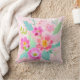 Dieses Kissen ist feminin und farbenfroh, mit verschiedenen Blume in Rosa, Orange, Gelb und Weiß, die mit grünen und aqua-Blätter auf einem weichen rosa Hintergrund ergänzt werden.