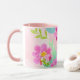 Diese Tasse ist mit einem femininen, farbenfrohen Bouquet aus verschiedenen Blume in Rosa, Orange, Gelb und Weiß ausgestattet, die durch grüne und aqua Blätter auf einem weichen rosa Hintergrund ergänzt werden.