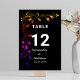 Eleganter schwarzer Hintergrund mit dieser Hochzeitskarte. Blume und Blätter auf gelben, orangefarbenen, rosa lila und blauen Reben. Eckbilder auf der Vorder- und Rückseite. Bestellen Sie jede Tischnummer einzeln. Ideal für eine Hochzeit im Herbst oder zu jeder Jahreszeit. Personalisieren Sie den Text für Ihre Informationen. Matching Produkte sind erhältlich.