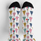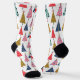 Diese Socken mit niedlichem Holiday-Thema haben ein sich wiederholendes Muster bohischer Weihnachtsbäume in verschiedenen Farben und Mustern. Die Bilder werden auf einem weißen Hintergrund platziert. Feierlich, hell und farbenfroh!