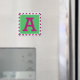 Der Buchstabe 'A' der Hauptstadt ist fuchsienfarben auf einem hellgrünen Hintergrund. Der Rahmen hebt sich in der fuchsienfarbenen Farbe des Briefes ab und hat ein diamantförmiges Design rund um den Rand in fuchsia und weiß.