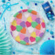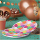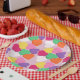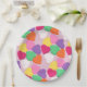 Rosa, lila, gelbe, orangefarbene und grüne Kerzenherzen auf hellrosa Hintergrund.