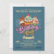 Eine bunte Geburtstagseinladung mit einem Trio köstlich aussehender Kuchen. Extravagante blüh-Additionen schaffen einen schönen Retro-Look.
