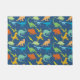 Farbenfrohe Dinosaurier-Silhouette. Tyrannosaurus Rex, Titanosaurier, Triceratop, Raptoren, Ankylosauren, Dino-Birds, Stegosaurus, Apatosaurus, Pteranodon und mehr in einem farbenfrohen Muster in blauem Hintergrund, und Dinosaurier in grün, blau, gelb und orange.