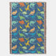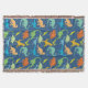 Dinosaurier-Silhouette Tyrannosaurus Rex, Titanosaurier, Triceratop, Raptoren, Ankylosauren, Dino-Birds, Stegosaurus, Apatosaurus, Pteranodon und mehr in einem farbenfrohen Muster in blauem Hintergrund, und Dinosaurier in grün, blau, gelb und orange.