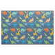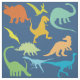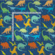 Farbenfrohe Dinosaurier-Silhouette. Tyrannosaurus Rex, Titanosaurier, Triceratop, Raptoren, Ankylosauren, Dino-Birds, Stegosaurus, Apatosaurus, Pteranodon und mehr in einem farbenfrohen Muster in blauem Hintergrund, und Dinosaurier in grün, blau, gelb und orange.