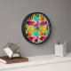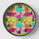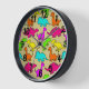 Diese Wanduhr hat ein neues Design von Dinosauriern, die über das Design verteilt sind.