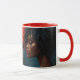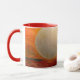 Eine Tasse mit einem großen, strukturierten weißen Kreis, der dem Mond ähnelt, mit einer reichen Farbpalette von warmen Farben wie Orange und Rot auf der einen Seite und coolen Tönen wie Blau auf der anderen Seite. Im Vordergrund steht eine Silhouette des Köpfs einer Person, die der Komposition Tiefe und Intrige verleiht