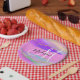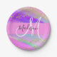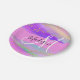 Girly und Glam Papierteller mit rosa, lila, lila, blau und grün farbigen einfarbigen Regenbogenuntergrund und vergoldeten Glitzer Glitzern Confetti. Individuelle Name und Monogramm sind in einem handgeschriebenen, eleganten Skript mit rosa Hintergrund geschrieben.