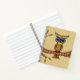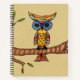 Dieses Wendelheft ist bräunlich mit einer bunten, fantasiegelben Eule mit großen blauen Augen, die auf einem Baumzweig mit grünen Blätter vorne und hinten sitzen.