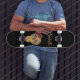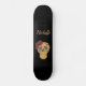 Blumenskateboard mit einem farbenfrohen, gelben und roten Skelettbild auf schwarzem Hintergrund. Mit der gelben, anpassbaren Typografie-Schrift können Sie mit Ihrem eigenen Text personalisieren. Ein lustiges, individuelles Objekt für Ihren Spaß.