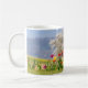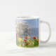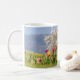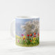 Freuen Sie sich auf fröhliche Blume mit roten und rosafarbenen Tulpen, eine blühende Wilddiele gegen weiße Baumblüten an einem sonnigen, hellen Frühlingstag mit blauen Himmeln. Ein wunderschönes Landschaftsbild-Foto von Katho Menden. Diese Tasse ist eine bezaubernde Geschenkidee für Naturliebhaber.