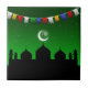 Farbenfrohe Illustration mit einer festlichen Garage in einer magischen Nachtszene mit einer Moschee Silhouette und dem Mond und den Sternen auf einem grünen Nachthimmel.