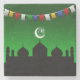 Farbenfrohe Illustration mit einer festlichen Garage in einer magischen Nachtszene mit einer Moschee Silhouette und dem Mond und den Sternen auf einem grünen Nachthimmel.