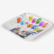 Eine farbenfrohe quadratische Papiertüte mit glücklichen Bollen zum Geburtstag und Kuchen.