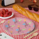 Design mit lustigen Halloween-Figuren. Sonnige Geister in Rosa. Dress up your table with this fun design. Sehen Sie sich die gesamte Sammlung an. Ideal für Party im Herbst.