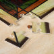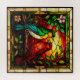 Lebhaftes Buntglasbild eines grünen und roten Vogels, umgeben von dekorativem Laub mit Sonnenuntergang. Exquisite Handwerkskunst, die die Eleganz und Harmonie der Tierwelt in künstlerischen Details darstellt.