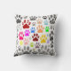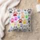 Dekoratives Kissen mit Bildern in vielen Farbtönen niedlicher Hundepfoten überall. Version mit grauem Hintergrund. Design im Cartoon. Eine Geschenkidee für Erwachsene und Kinder, die Liebe Hunde.