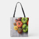 Genießen Sie die atemberaubende Tasche mit dem Motto "All-over-print" mit hausgemachten (und ungerollten) Medaillen aus gestreiften, grünen, lila und gelben Tomaten auf einem verwitterten grauen Picknicktisch, die sich hervorragend zur Verbesserung des Muskelgedächtnisses eignet. Zu den kultivierten Tomaten zählen Grüne Zebra, Rote Zebra, Indigo-Rose, Brandywine, Black Prince, Mitternacht-Snack-Kirsche und Erbkirsche. Basierend auf der Originalfotografie von W.H. Sim. Alle Rechte vorbehalten. Weitere Informationen unter zazzle.com/walkswithnature