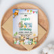 Diese bezaubernde 6. Geburtstagskarte für Kinder zeigt ein bezauberndes Safari-Thema. Es enthält eine hübsche, von Hand gezeichnet Abbildung einer Giraffe, Leoparden, Nashörner, Löwen, Elefanten und Vögel. Der beiliegende Text lautet: "Bald wird ein hübscher kleiner wilder kommen." Diese Einladung ist ideal für eine geschlechtsneutrale Feier.