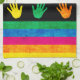 Dieses lebhafte Design strahlt farbenfroh aus und besticht durch eine lebhafte Mischung aus abstrakten Wirbel in Rosa, Gelb, Orange, Grün und Blau. Die Oberseite ist mit einem kühnen schwarzen Streifen versehen, der Regenbogenfarben mit Handdrucken zeigt. Unten vervollständigen strukturierte horizontale Streifen in den gleichen hellen Tönen die Komposition. Der spielerische Mix aus Formen, Handmotiven und lebhaften Tönen schafft ein fröhliches, energiesparendes Aussehen, das Kreativität, Individualität und Ausdruckskraft zelebriert. Sein kühner Kontrast und seine künstlerische Struktur machen ihn zu einem dynamischen und auffälligen Muster.
