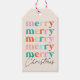 Ein modernes, buntes und fröhliches Weihnachtsgeschenk-Tag mit dem Wort "fröhlich" mehrmals übereinander geschrieben in schönen Urlaubsatorfarben. Das Wort "Weihnachten" ist in einer modernen Schrift geschrieben. Die trendige Typografie macht dies zu einer beliebten Wahl.