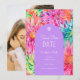 Das farbenfrohe, moderne tropische Foto mit floralen Hochzeiten in tropischen Wasserfarben ist Save the Date mit farbenfrohen tropischen Blume in Rosa, lila, Orange, Grün und Türkis ausgestattet. Fügen Sie Ihre individuellen Save the Date Einladungsinformationen in den Rahmen in eleganter weißer Kalligrafie-Schriftzeichen-Typografie hinzu. Auf der Rückseite fügen Sie Ihr Lieblings-Foto. Personalisieren Sie den Text in den Textfeldern, indem Sie ihn bearbeiten. Für Sie entworfen von Evco Studio www.zazzle.com/store/evcostudio