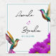 Ein lebendiges und fröhliches Hochzeitskonzept mit zwei irisierenden Kolibris und lebhaften, lila Blume. Ein spielerisches und helles Design, das sich perfekt für Frühlings- oder Sommerfeiern mit voller Liebe und Energie eignet.