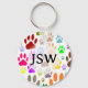 Überall drucken Bilder von Hundepfoten. Farbvolles Design im Cartoon. Maßgeschneiderte Schlüsselanhänger für Hundefreunde. Bearbeiten von Initialen zum Anpassen. Geschenkidee.