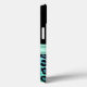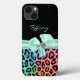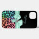 Modische iPhone-Gehäuse in schwarz, oben und ein farbenfroher gepunkteter Jaguar-Druck, unten. Die Grafik eines Minzband und Bogen, mit einem Diamantakzent, schmückt die Mitte des Gehäuses. Personalisieren Sie den minzfarbenen Text für sich selbst oder als reine Geschenkidee.