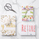 Ein Design verfügt über Gold Konfetti mit einer Vorlage Text-Version des glücklichen Ruhestands. Die zweite ist mit bunten Konfetti Streifen mit dem gleichen Text und das dritte Blatt hat farbige Bänder oben und unten mit dem gleichen Text.