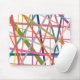 Dieses Mauspad hat ein geometrisches Design verstreuter Linien in Blumenfarben - Rosa-, Orange-, Gelb-, Blau- und Grüntönen.