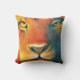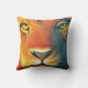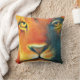 Ein Kissen mit einem Ölgemälde von einem nahen lionenförmigen Gesicht, mit durchdringenden gelben Augen. Die dominierenden Farben sind orange und gelb.